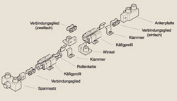 Der Spannsatz ist mit einem Einfach-Kettenverbindungsglied mit der eigentlichen Kettenzahnstange verbunden. Die Führung der Kette erfolgt im Käfigprofil aus Werkstoff ´S´®1000 grün. Dieses wird von außen von einem Stahl-C-Profil umklammert. Die Stahl-C-Profile werden mit Klammern auf dem Untergrund fixiert. Bei Kettenlängen über 2500 mm werden zusätzlich Befestigungswinkel eingebaut. Diese sind mit Duplex-Verbindungsgliedern in die Zahnstange integriert. Dadurch wird ein Verschieben der Kettenzahnstange im Käfigprofil beim Anfahren und Abbremsen vermieden. Kettenzahnstangen sind in den Kettengrößen 1/2", 5/8", 3/4" und 1" erhältlich.